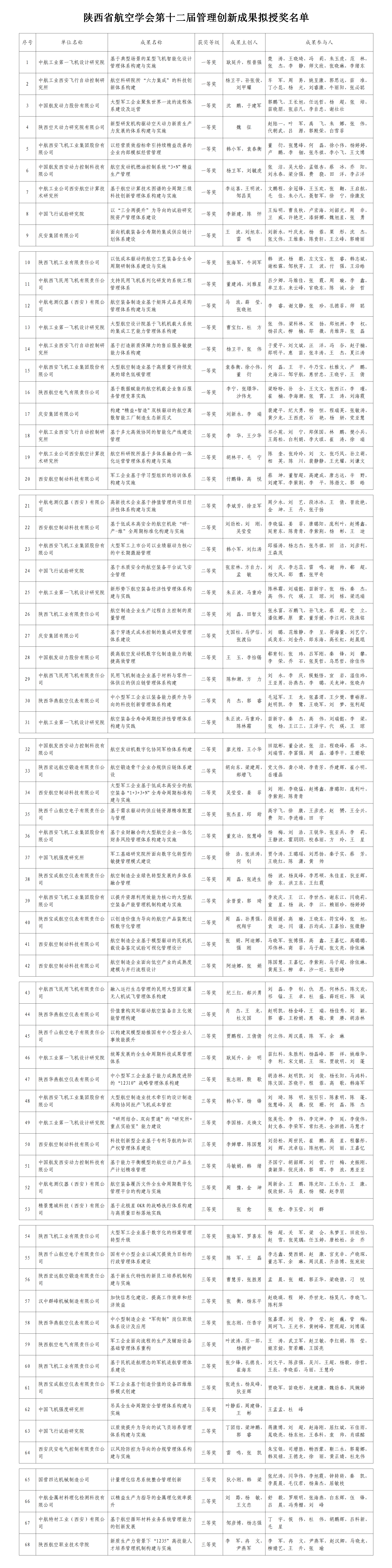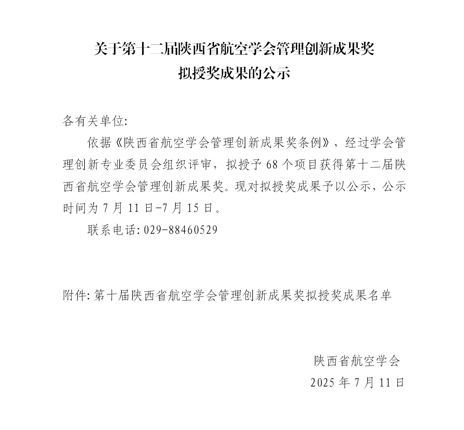 关于第十二届陕西省航空学会管理创新成果奖拟授奖成果的公示